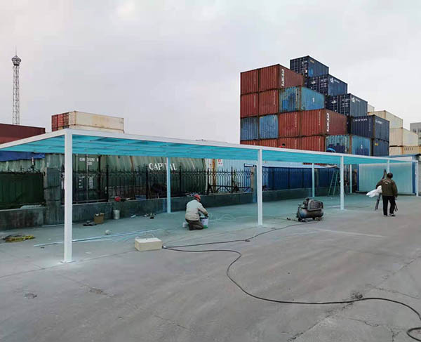 客户看了方案之后很满意,紧接着我们工作人员就开始制作该车棚搭建所需要的的材料,经过一个周的时间我们将客户想要的停车棚制作并安装完成,大家可以从图中看到我们安装的车棚的整体效果。