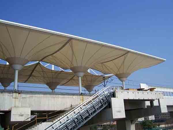 膜结构大多用于体育馆膜结构看台、剧院、展览建筑的观众厅、展览厅,其面积、长度可以根据需要确定,但如果用于商业、学校、食堂、菜市场等建筑,就要受规范的限制了,必须作防火分区,但这种建筑大多高度及跨度都很大,划分防火分区比较困难,因此,一旦发生火灾,各种垂直通道起拔火桶作用。当烟气到达膜面以下时,顶部气流水平运动,致使火灾横向扩大,容易形成大面积的火灾蔓延。