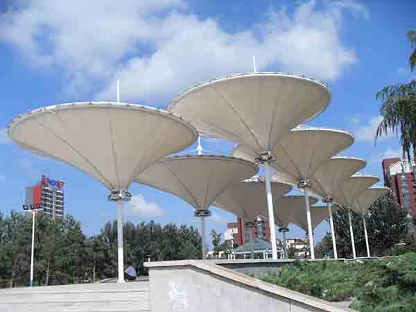 用于膜结构中的高强度柔韧性薄膜称为膜材,它是膜结构工程中重要的组成部分,作用与钢筋、混凝土、轻质板材上是等同的,在膜结构建筑中既是起围护作用的建筑材料,又是张拉结构体系中的受力材料。《建筑设计防火规范》及《高层民用建筑防火设计规范》中对建筑物各构件的燃烧性能和耐火极限都有明确的规定。目前膜结构建筑中使用的膜材通常有两类,一类是以玻璃纤维织物为基材,涂覆聚四氟乙烯(PTFE)等树脂材料,燃烧性能可达到A 级;另一类是以尼龙织物为基材,涂覆PVC 及其他树脂材料,燃烧等级可以达到B1 级。